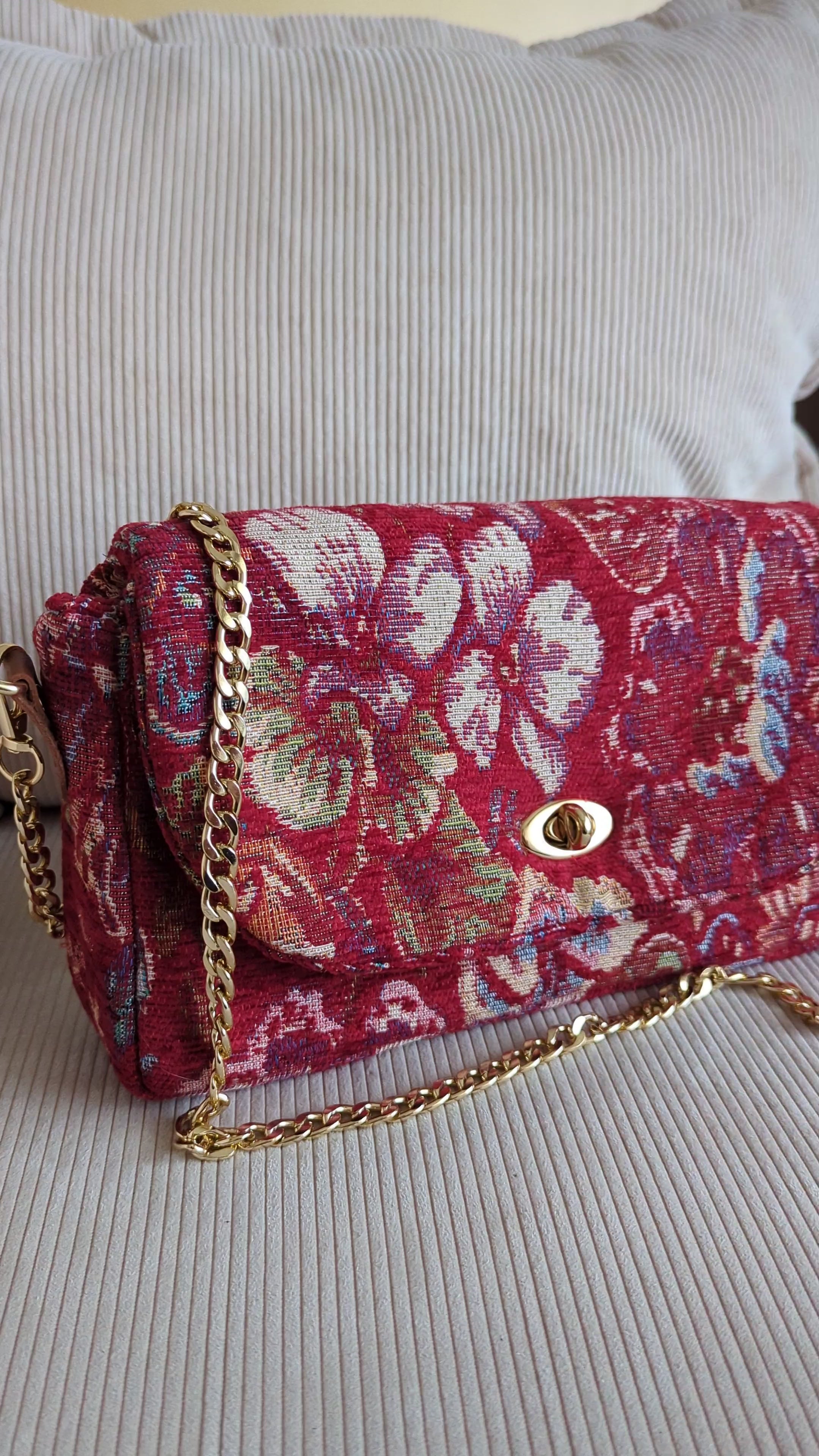👜 Le sac Soiree au coin du feu m'evoque la chaleur, le confort des soirées familiales. Son tissu en jacquard chenille rouge vif avec ses motifs floraux, me font penser aux couvertures épaisses d'autrefois . Ce sac est conçu pour celles qui aiment porter l'élégance passionnée et qui affirment leur singularité par la richesse des couleurs